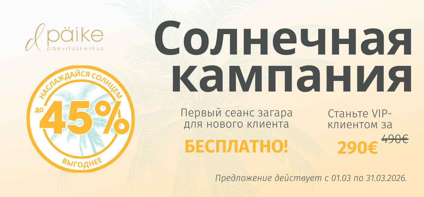 Посещение D päike для меня как маленький побег от скучных будней – наконец-то можно потянуться голыми пальцами ног прямо как на пляже под приятными солнечными лучами, наслаждаясь, в то же время, прекрасной музыкой. Особенно радует, что карамельный оттенок загорелой кожи можно получить безопасно, предпочитая сеанс D päike. До новых солнечных встреч! :)
